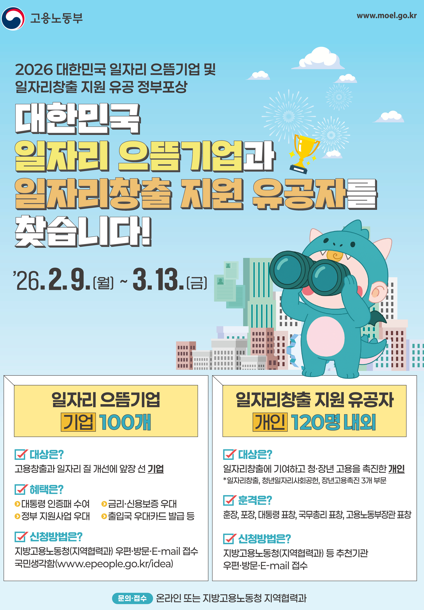 | 2026 대한민국 일자리 으뜸기업 및 일자리창출 지원 유공 정부포상 안내 | |||