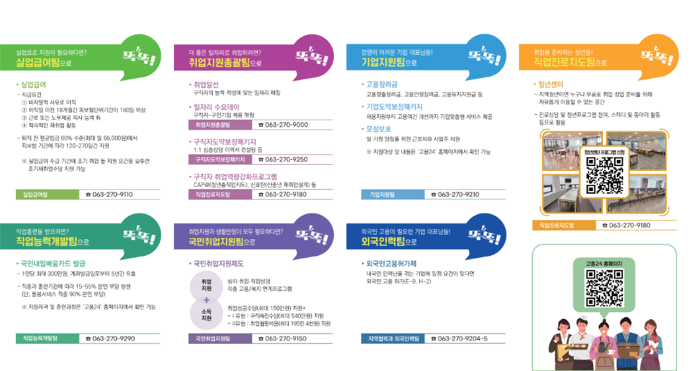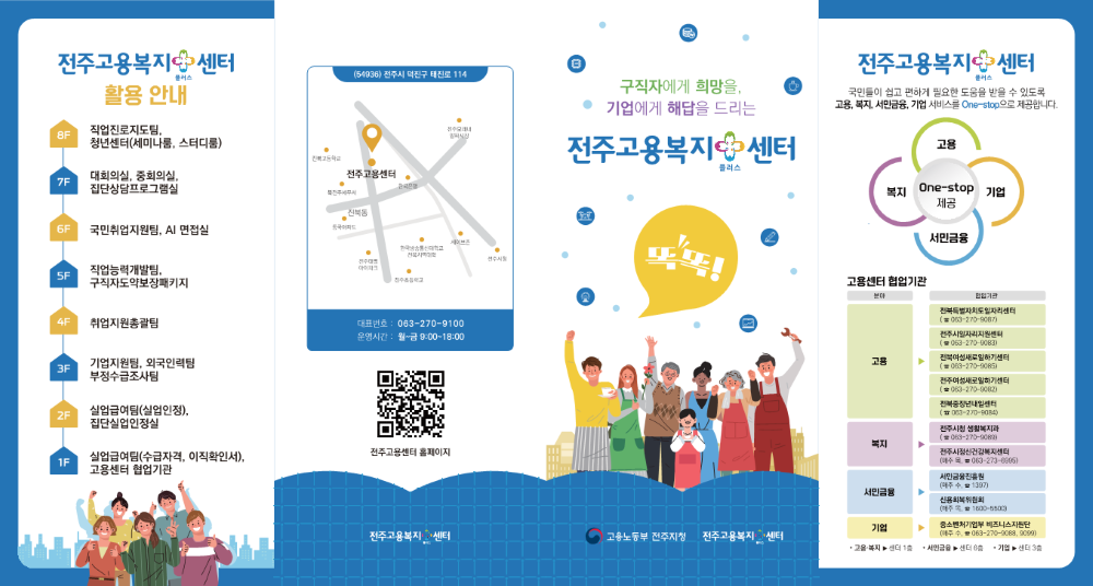 구직자에게 희망을, 기업에게 해답을 드리는 전주고용복지플러스센터 똑똑! . 전주고용복지플러스센터의 위치, 팀별 사업, 협업기관 등을 안내하는 리플릿을 게시합니다. 고용센터 방문 및 이용시 참고하시기를 바랍니다. 감사합니다. . ![]() ![]() |