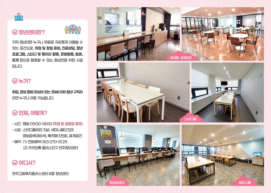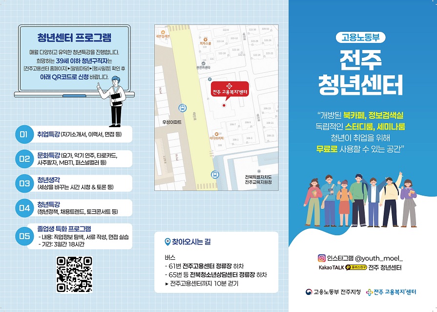 취업을 준비하는 청년들, 청년센터로 똑똑! . 전주고용복지플러스센터 8층에 위치한 청년들을 위한 공간, 청년센터를 안내하는 리플릿을 게시합니다.청년센터 방문 및 이용시 참고하시기를 바랍니다. 감사합니다. ![]() ![]() |