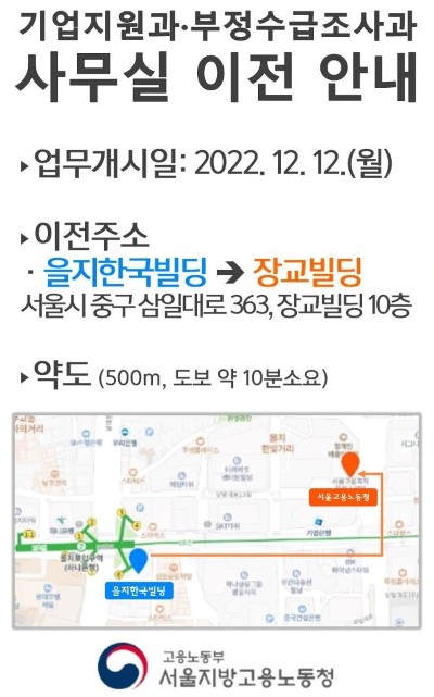 12월 12일자로 기업지원과(모성보호, 고용안정), 부정수급조사과가 별관(을지한국빌딩)에서 서울고용노동청 본관으로 이전하오니 참고해주시길 바랍니다.