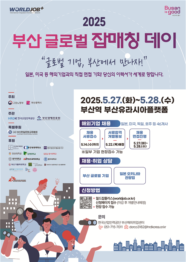 「2025 부산 글로벌 잡매칭 데이」 □ 행사 개요 ㅇ (일시) ‘25. 5. 27.(화) ~ 5. 28.(수), 10:00~17:00 [국내기업은 27일만 운영] ㅇ (장소) 부산유라시아플랫폼(부산광역시 동구) ㅇ (주최/주관) 고용노동부, 부산광역시 / 한국산업인력공단, 부산경제진흥원 ㅇ (행사 규모) 해외46개사, 부산글로벌기업5개사, 구직자 600여명 <주요 행사>