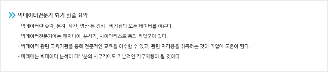 빅데이터전문가로 부를 수 있는 직업군은 크게 세 가지 분야로 나눌 수 있다. 첫 번째는 데이터 엔지니어다. 데이터를 수집, 저장, 분석하고 시각화를 통해 정보를 전달하는 일이다. 데이터 알고리즘에 대한 이해가 필요하고 설계(기획)하는 일을 담당한다. 구체적으로 Java, 파이썬 같은 코딩언어에 익숙해야 한다. 두 번째는 데이터 사이언티스트, 혹은 데이터 분석가다. 데이터 결과를 이해하고 해석해 실제 기업이나 공공기관 등에서 활용할 수 있도록 결과를 도출해내는 일이다. 최근에는 IT업계뿐 아니라 정부, 공공기관, 제조, 금융, 소매, 농업, 서비스, 의료 등 산업 전반에서 빅데이터 분석 전문인력을 필요로 하고 있다. 데이터 분석가가 창출해낸 빅데이터 정보는 데이터 사이언티스트에 의해 더 고차원의 기술로 치환된다. 인공지능, IoT, 로봇공학, 의학 등 빅데이터 분석에 기초한 과학기술의 발전이 여기에 해당한다.
