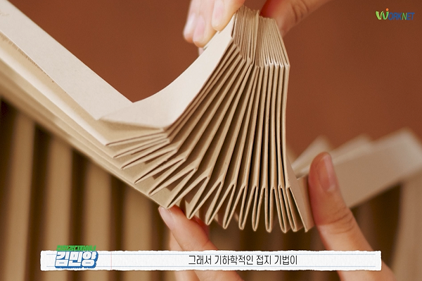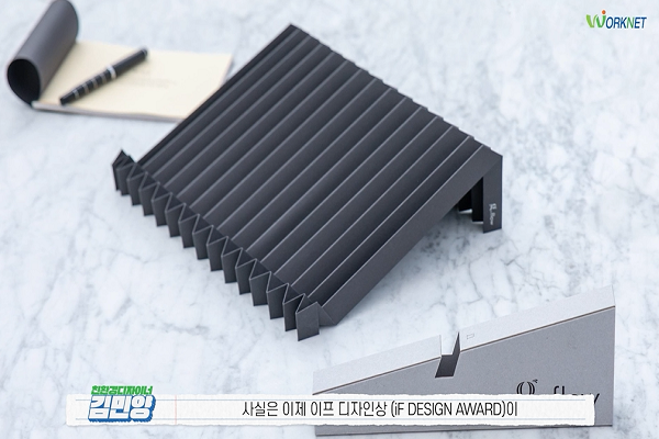 재생종이 한 장을 어떠한 화학적 가공 없이 접어서만 만든 거치대예요. 여기에 노트북이 올라가는데 이 원래 무게는 100g도 되지 않지만 이 무게의 10배가 올라갈 수 있는 (100배 이상의 무게를 버티는) 굉장히 튼튼한 지지력을 가진 아이디어 상품입니다. 이 종이를 펼치면 그냥 한 장의 종이거든요. 이것을 접음으로써 이런 축이 발생하고 힘을 지지하는 이런 구조가 발생함으로써 무거운 무게를 버틸 수 있는 거죠. 저도 이러한 부분에 매력을 느껴서 다양하게 종이를 접다가 결국 스탠드를 만들 수 있게 되었습니다.