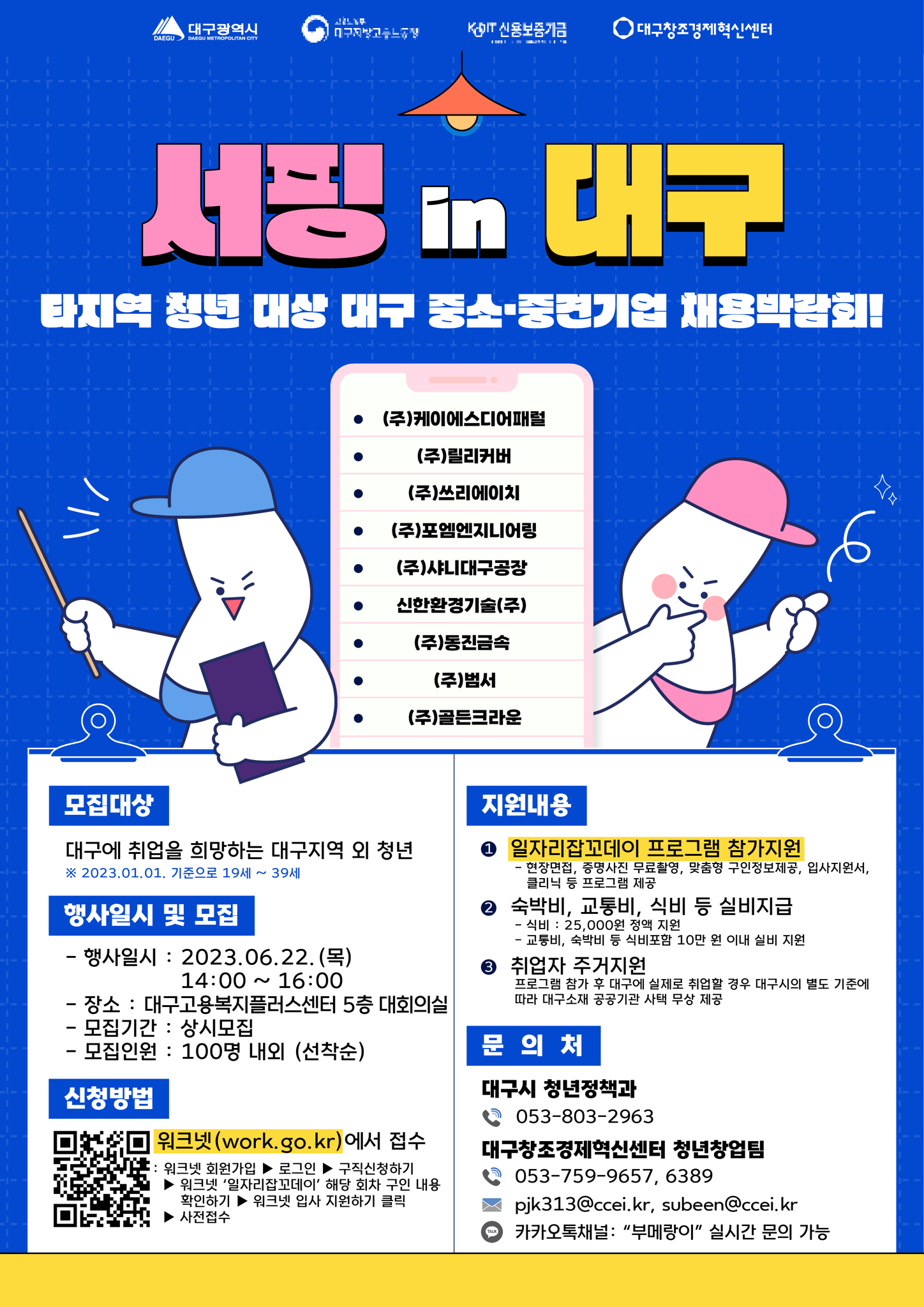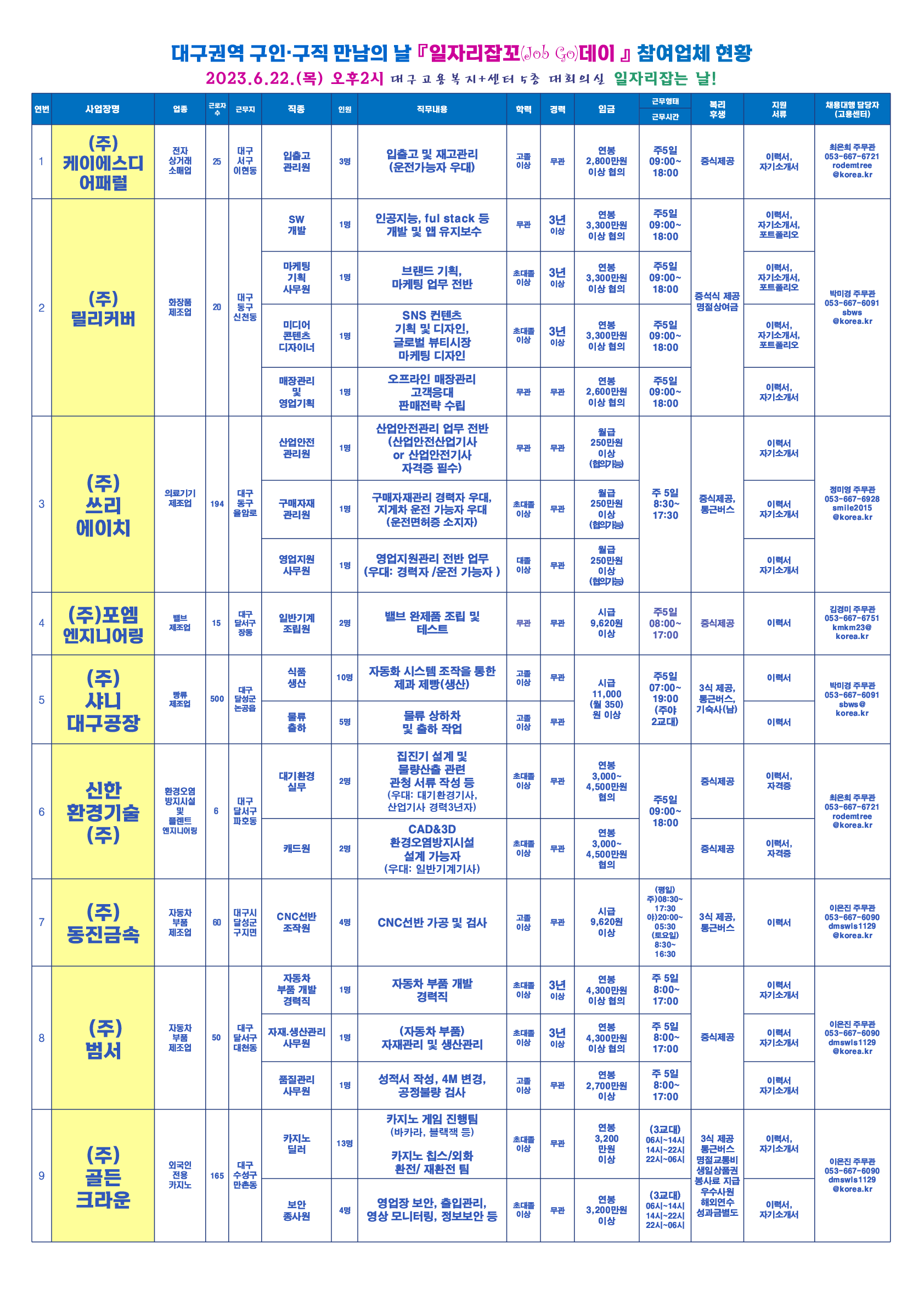 | '23.6.22.(목) 오후2시 구인·구직 만남의 날_'일자리잡꼬데이' 참여기업목록 | |||