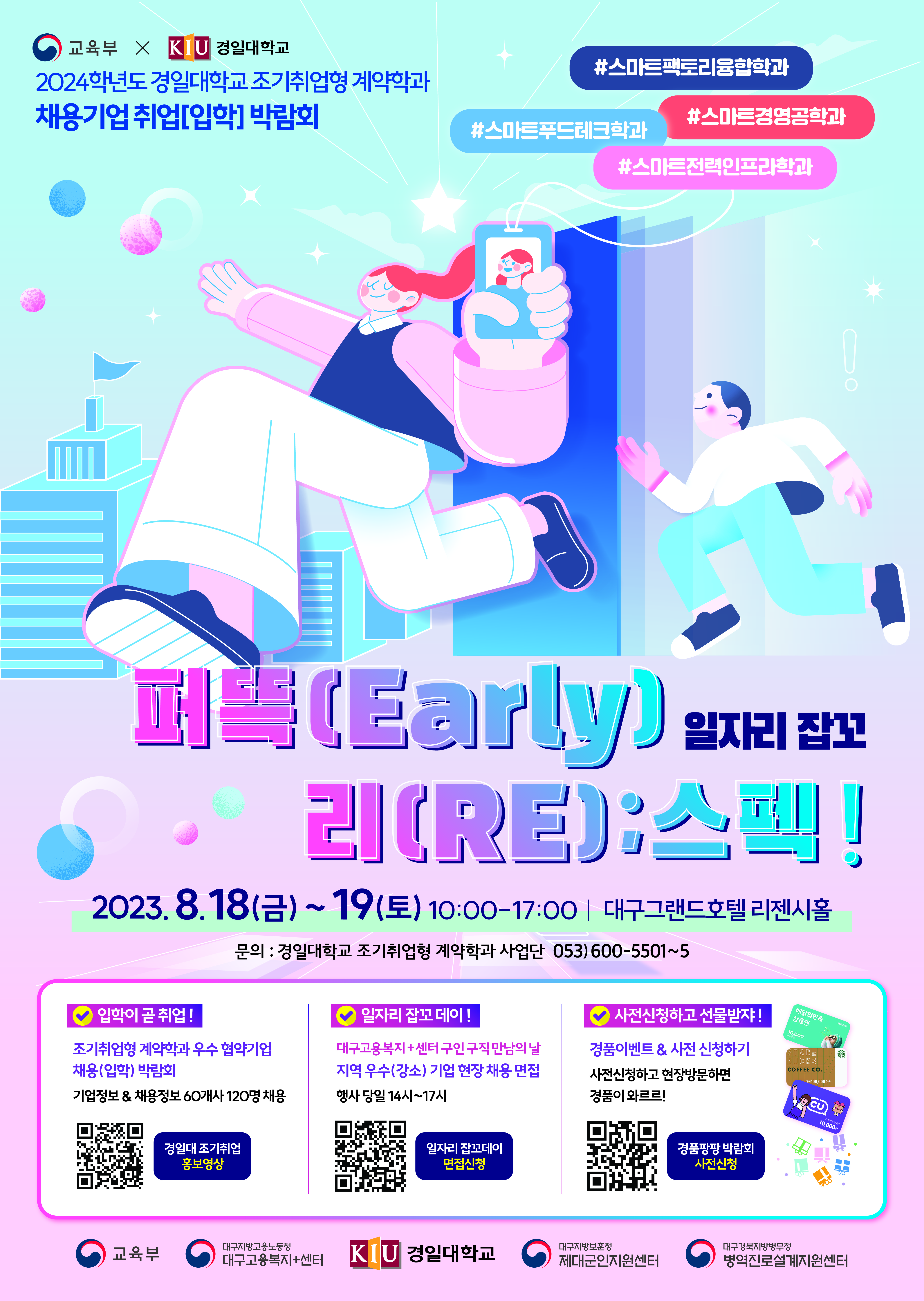 8월 일자리잡꼬데이는 "경일대학교 조기취업형 계약학과채용기업 취업[입학] 박람회" 와 동시 진행합니다. 아래로 링크하시면 바로 구인내용 확인이 가능합니다. |