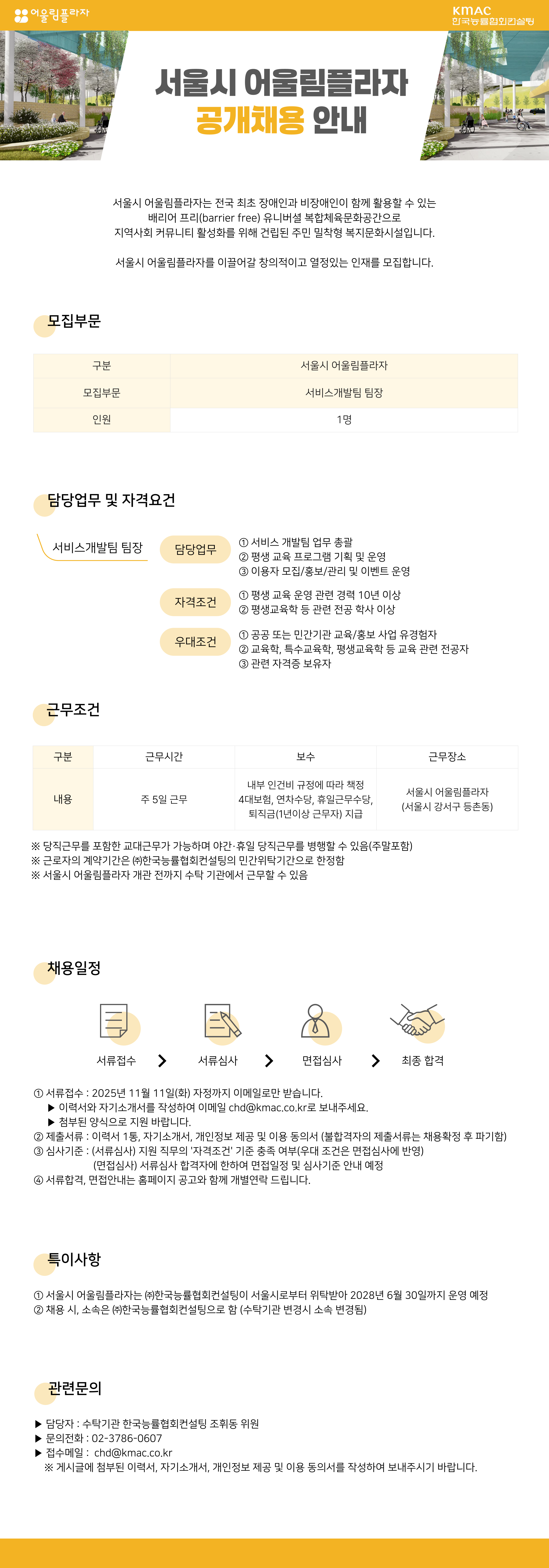 | 서울시 어울림플라자 교육기획팀 팀장 공개채용 | 1명 | 기간의 정함이 있는 근로계약 |