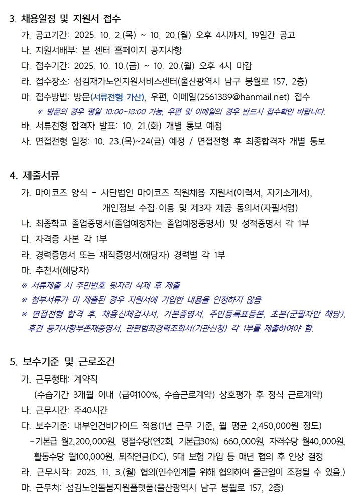 나. 근무시간: 주40시간 다. 보수기준: 내부인건비가이드 적용(1년 근무 기준, 월 평균 2,450,000원 정도) -기본급 월2,200,000원, 명절수당(연2회, 기본급30%) 660,000원, 자격수당 월40,000원, 활동수당 월100,000원, 퇴직연금(DC), 5대 보험 가입 등 매년 협의 후 인상 결정 라. 근무시작: 2025. 11. 3.(월) 협의(인수인계를 위해 협의하여 출근일이 조정될 수 있음.) 본 센터 채용공고문의 참고하여 지원해 주시기 바랍니다. 동료가 무거운 짐을 들고 있으면 내 일을 잠시 멈추고 함께 도와줄 수 있는 분과 함께하고 싶습니다. 많은 지원 부탁드립니다. |