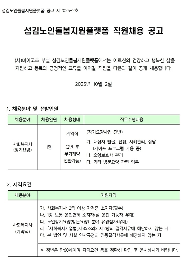 [기타서류양식] (2025-2 공고문)섬김노인돌봄지원플랫폼 채용공고(사회복지사_방문요양)001.jpg [기타서류양식] (2025-2 공고문)섬김노인돌봄지원플랫폼 채용공고(사회복지사_방문요양)002.jpg [기타서류양식] (2025-2 공고문)섬김노인돌봄지원플랫폼 채용공고(사회복지사_방문요양)003.jpg [자사이력서양식] 섬김노인돌봄지원플랫폼 채용지원서(양식).hwp |