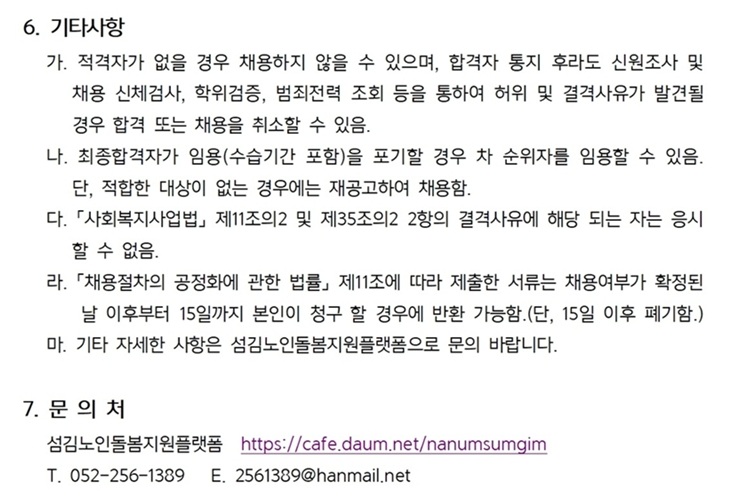 이력서(자사이력서양식),자기소개서,졸업증명서,경력증명서, 기타 (반드시 자사 지원서 양식으로 작성하여 제출해 주세요 추가 제출서류가 더 있으니 확인하시고 빠짐없이 제출해 주시기 바랍니다. 본 기관 홈페이지 (https://cafe.daum.net/nanumsumgim/W2Gy/96) 공지사항을 참고하여 제출해 주세요) ※ 자사이력서를 제출서류양식에서 다운로드받아 작성 후 입사지원 하시기 바랍니다. |