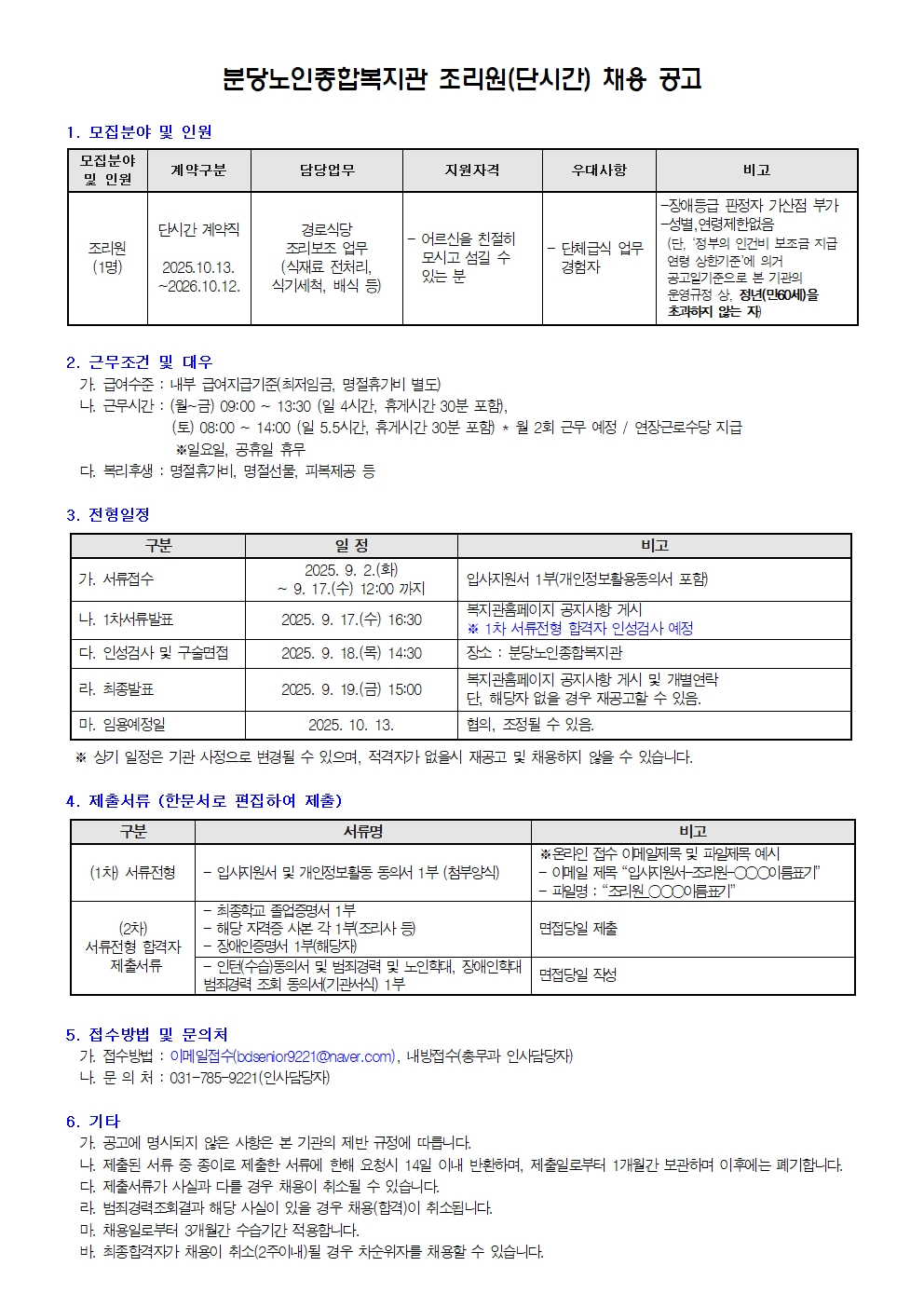 [기타서류양식] 2025.9.2. 채용공고문(조리원).jpg [자사이력서양식] ※양식_분당노인종합복지관 입사지원서(조리원).hwp |