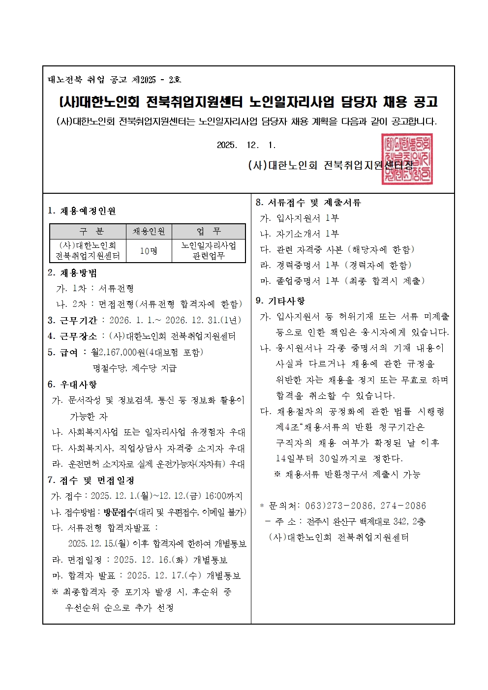 1. 문서작성 및 정보검색, 통신 등 정보화 활용이 가능한 자 2. 사회복지사업 또는 일자리사업 유경험자 우대 3. 사회복지사, 직업상담사 자격증 소지자 우대 4. 운전면허 소지자로 실제 운전가능자(자차有) 우대 ★방문접수만 가능, 하단 자사 이력서양식 활용 필수 ★업체에 알선(소개) 희망자는 고용24 구직등록 063-270-9003으로 "대한노인회 전북취업지원센터 알선희망" 문자 주세요 |