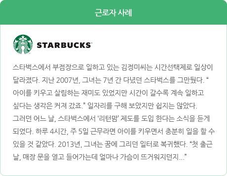 스타벅스에서 부점장으로 일하고 있는 김정미씨는 시간선택제로 일상이 달라졌다. 지난 2007년, 그녀는 7년 간 다녔던 스타벅스를 그만뒀다. “아이를 키우고 살림하는 재미도 있었지만 시간이 갈수록 계속 일하고 싶다는 생각은 커져 갔죠.”일자리를 구해 보았지만 쉽지는 않았다. 그러던 어느 날, 스타벅스에서‘리턴맘’ 제도를 도입한다는 소식을 듣게 되었다. 하루 4시간, 주 5일 근무라면 아이를 키우면서 충분히 일을 할 수 있을 것 같았다.2013년, 그녀는 꿈에 그리던 일터로 복귀했다. “첫 출근 날, 매장 문을 열고 들어가는데 얼마나 가슴이 뜨거워지던지...”
