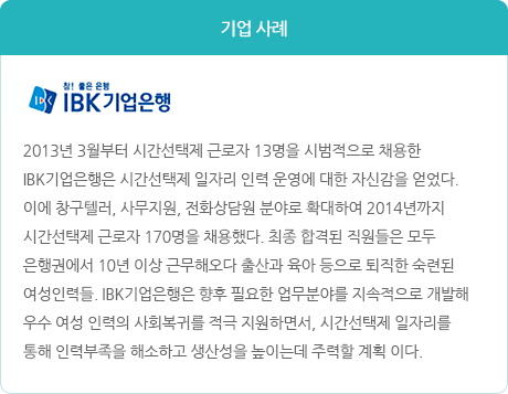 2013년 3월부터 시간선택제 근로자 13명을 시범적으로 채용한 IBK기업은행은 시간선택제 일자리 인력 운영에 대한 자신감을 얻었다. 이에 창구텔러, 사무지원, 전화상담원 분야로 확대하여 2014년까지 시간선택제 근로자 170명을 채용했다. 최종 합격된 직원들은 모두 은행권에서 10년 이상 근무해오다 출산과 육아 등으로 퇴직한 숙련된 여성인력들. IBK기업은행은 향후 필요한 업무분야를 지속적으로 개발해 우수 여성 인력의 사회복귀를 적극 지원하면서, 시간선택제 일자리를 통해 인력부족을 해소하고 생산성을 높이는데 주력할 계획이다.
