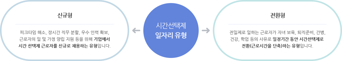 - 피크타임 해소, 장시간 직무 분할, 우수 인력 확보, 근로자의 밀 및 가정 양립 지원 등을 위해 기업에서 시간 선택제 근로자를 신규로 채용하는 유형입니다.