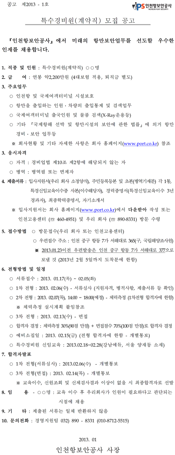 인천항보안공사 특수경비원 채용[채용대행]