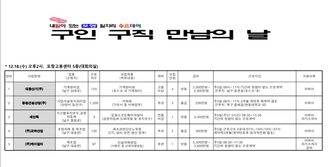 <내일이 있는 일자리 수요데이 구인구직 만남의 날 개최 안내> * 일시: 2024.12.18.(수), 14:00-16:00 * 장소: 포항고용센터 5층 대회의실 * 행사내용 - 현장면접: 5개사 10명 구인 * 참가 방법 - 구직자: 고용24(워크넷) www.work24.go.kr)에 구직신청 후 사업장별 제출서류 준비, 현장면접에 참여