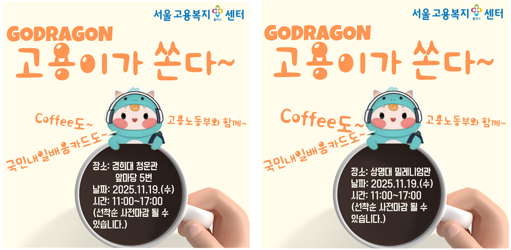 '국민내일배움Café' 고용이가 쏜다~ 커피도! 국민내일배움카드도! ㅇ장소: ① 경희대 청운관 앞마당 5번 / ② 상명대 밀레니엄관 ㅇ날짜: 2025. 11. 19.(수) ㅇ시간: 11:00~17:00 ※ 선착순 사전마감 될 수 있습니다. ![]() |