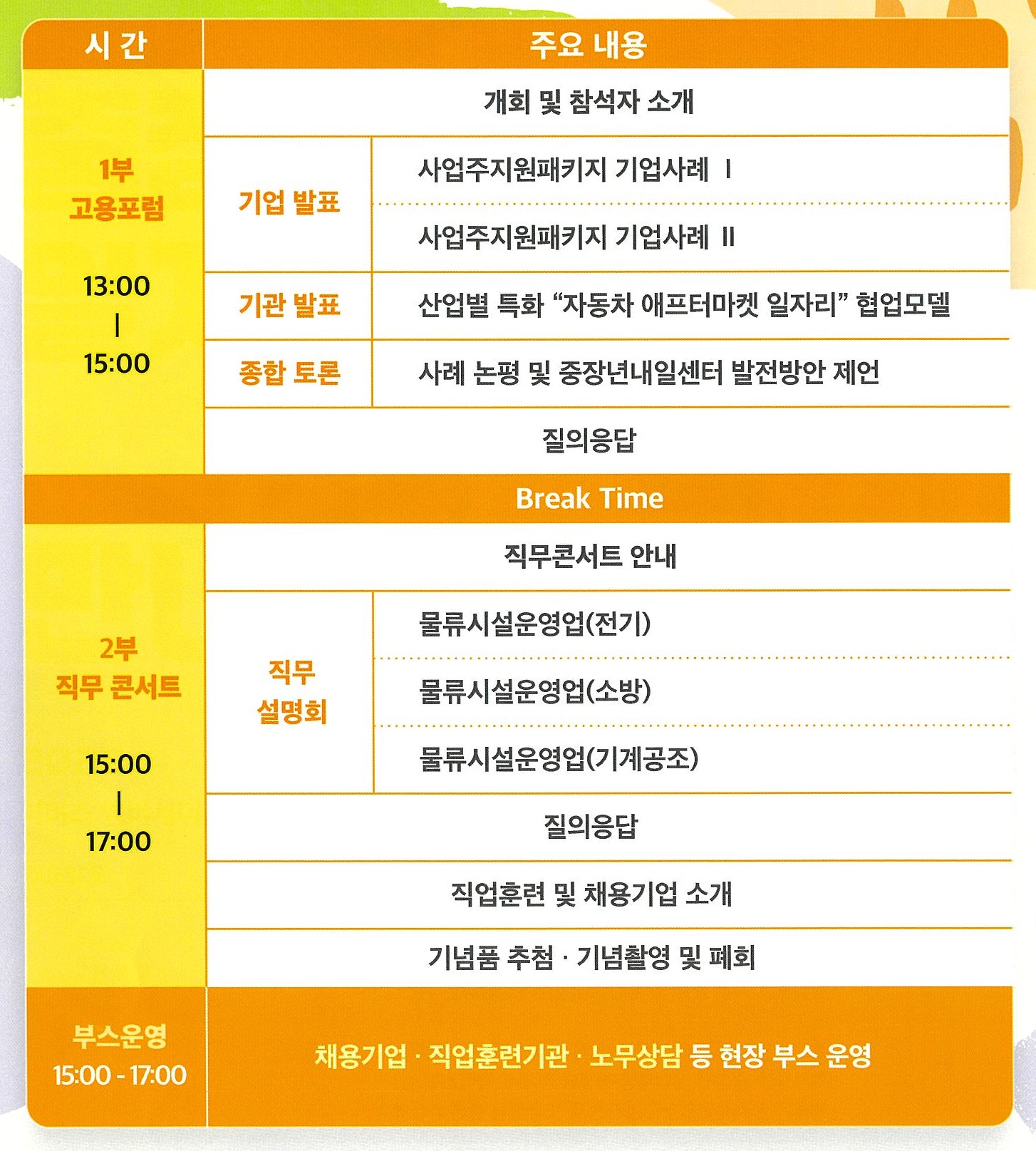 중장년의 직업훈련 확산 및 안정적 내 일 찾기 지원을 위하여 아래와 같이 행사를 개최하니 많은 참여 부탁드립니다. □ 행사 개요 ○ (행사명) 중·장년 커리어 새로고침 콘서트 ○ (일시) 10월 23일(목) 13:00∼17:00 ○ (장소) 이비스 앰배서더 수원 6층 니스홀(수원시 팔달구 소재) ○ (참석대상) 중장년 채용 사업주 및 구직자 약 100명 내외 ○ (주최·주관) 고용노동부 경기지청, 경기중장년내일센터, 경기지역인적자원개발위원회, 경기도기술학교 ○ (협업기관) (주)동성직업전문학교, 수원직업전문학교, 대원평생교육원, 라인전기학원 ○ (추진 방향) 중장년층 도약·지원을 위해 ‘고용포럼+직무토크쇼+훈련상담+채용행사’ 등을 결합한 종합 콘서트(페스티벌) 형식 □ 주요 내용 ○ (진행방식) 1부(고용포럼), 2부(직무토크쇼) 및 부대행사(직업훈련상담+채용행사+이벤트)로 진행 ○ (행사내용) ┏(고용포럼) 사업주 지원패키지 참여기업 사례, 중장년 일자리모델 협업 사례 및 전문가의 논평 및 발전방향 제언 ┣(직무토크쇼) 시설운영 전기, 소방, 기계공조 직무에 대한 직무설명 ┗(부대행사) 채용행사, 직업훈련상담, 노무상담, 참여자 대상 이벤트 등 * 채용기업 정보 - (주) 유경(자동차부품제조업), / 생산 및 품질관리/ 2~3명/ 월 280~300만원, 협의 가능/ 수원시 권선구 오목천로 152번길 40 - (주)에코인프라(건설인력공급업)/ 현장보조 및 공정별 기술업무/20명/ 기능 및 경력에 따라 1일 14만원~ / 건설기초안전교육 이수자(우대) - 지산(목형 금형 성형 관련 제조업)/ 목형 FRP 카본 몰드 제작/ 1명/ 연3000만원 협의가능/ 경기도 안성시 대덕면 무록로 210 - 행복집수리(도배 장식 등 인테리업)/ 인테리어 전기공사, 도배, 실내장식 및 내장 목공 업무/2명/ 오산시 수목원로 577-15